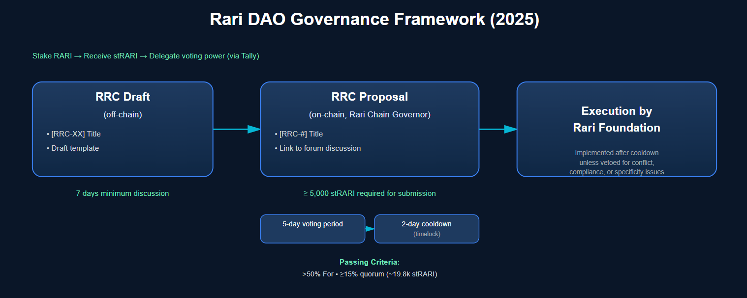 - Proposal threshold (to submit): 5,000 voting power (threshold originally specified in RRC‑1; now measured in stRARI voting power on Rari Chain).