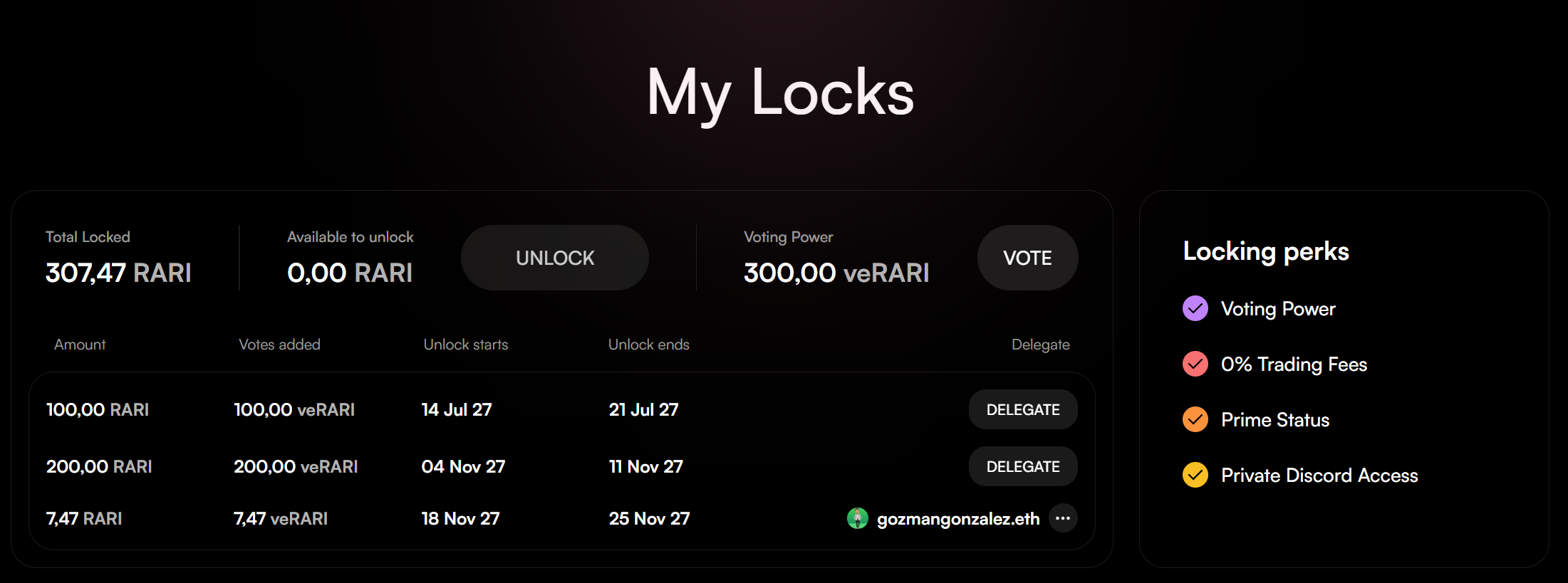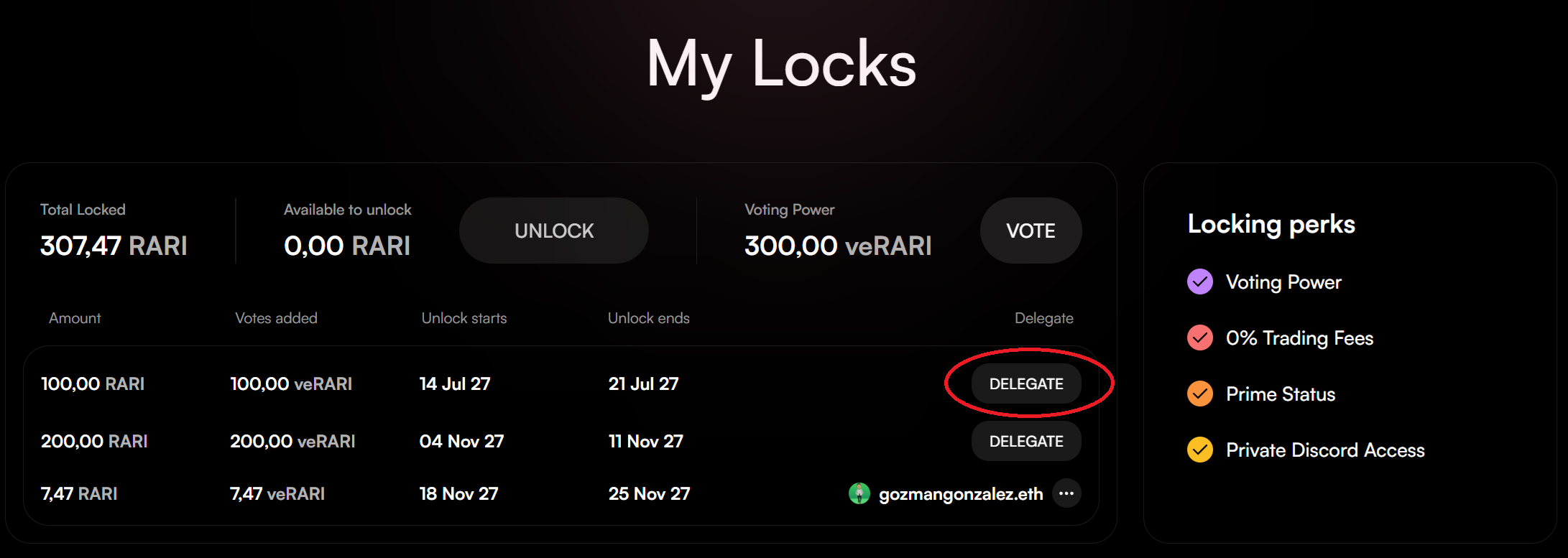 Scroll down the page to the “My Locks” section. Once you have connected your wallet and successfully locked your $RARI tokens your locks will appear.