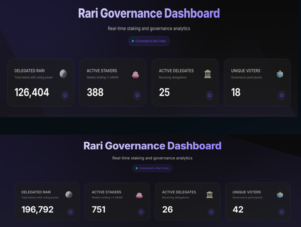 At programme launch in mid-June 2025, governance activity on Rari Chain was near zero as staking and delegation contracts had just been deployed. By early July, the Rari Governance Dashboard reported 126,404 delegated RARI, 388 active stakers, 25 active delegates, and 18 unique voters.