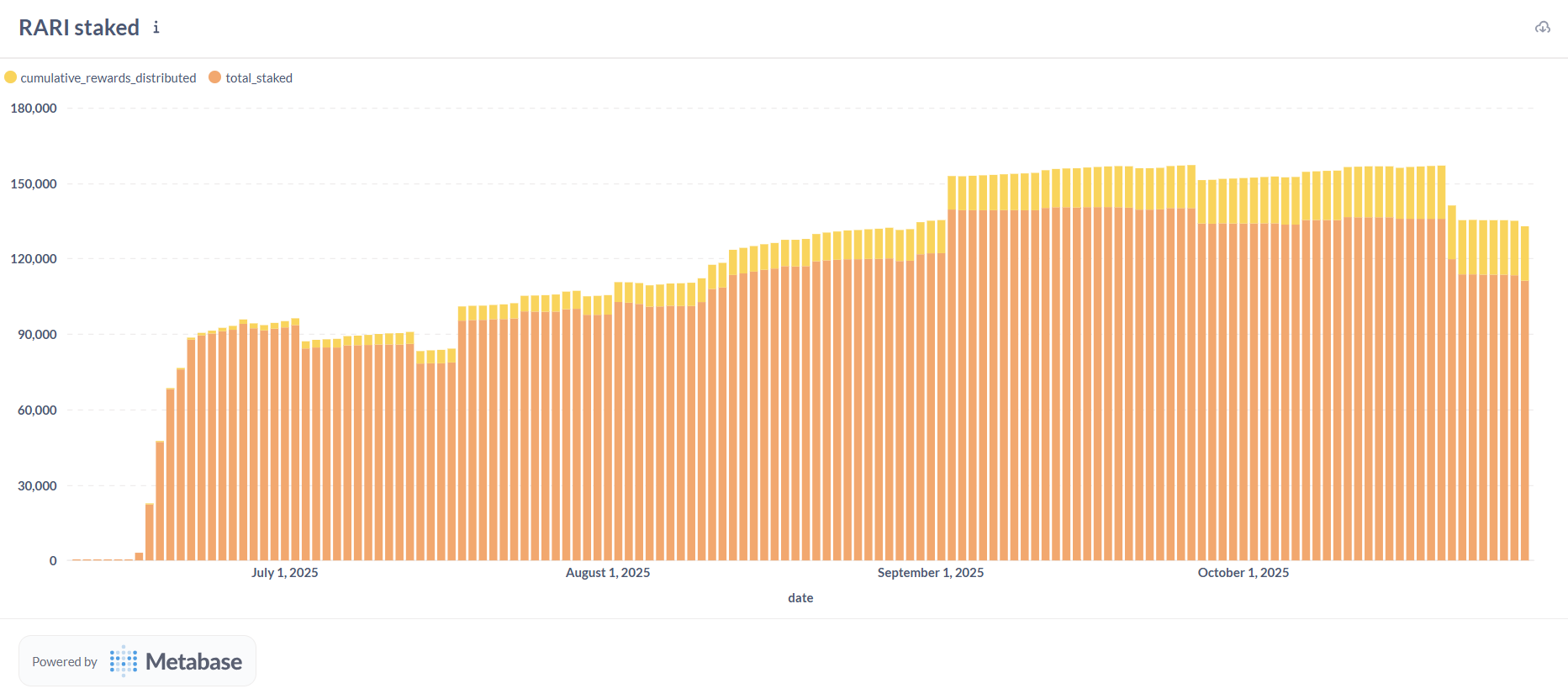 Data source. Daily on‑chain totals were exported from the “RARI staked” public card on Tally’s Metabase. The data set contains date, total_staked and cumulative_rewards_distributed fields from 11 Jun 2025 to 18 Oct 2025.